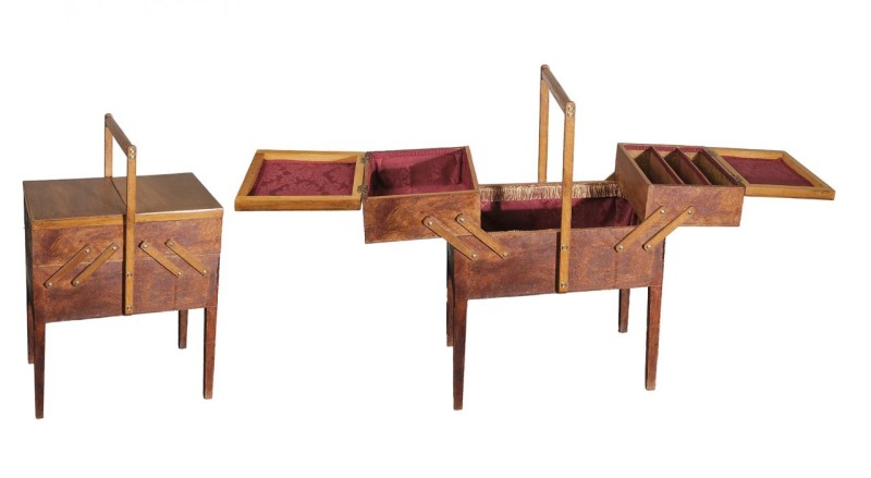 Costurero de pie en madera con sistema de apertura tipo acordeón. Europa, mediados del S. XIX