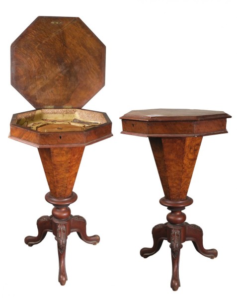 Costurero victoriano octogonal con tapa abatible en madera de raíz y pie de trípode con decoración tallada. Inglaterra, finales S. XIX
