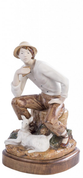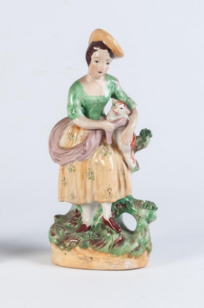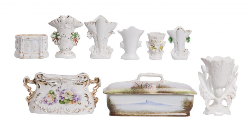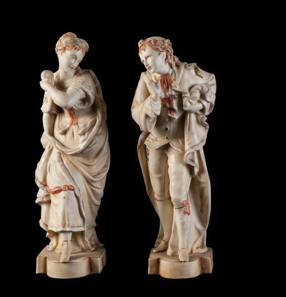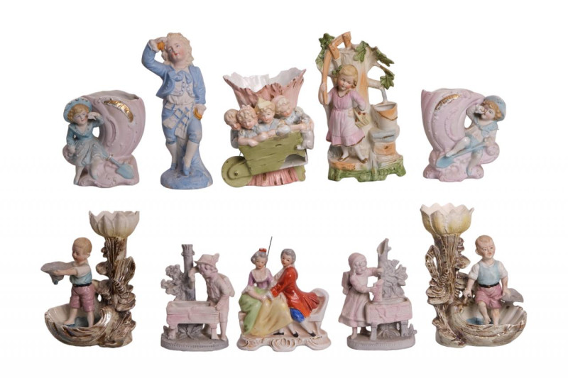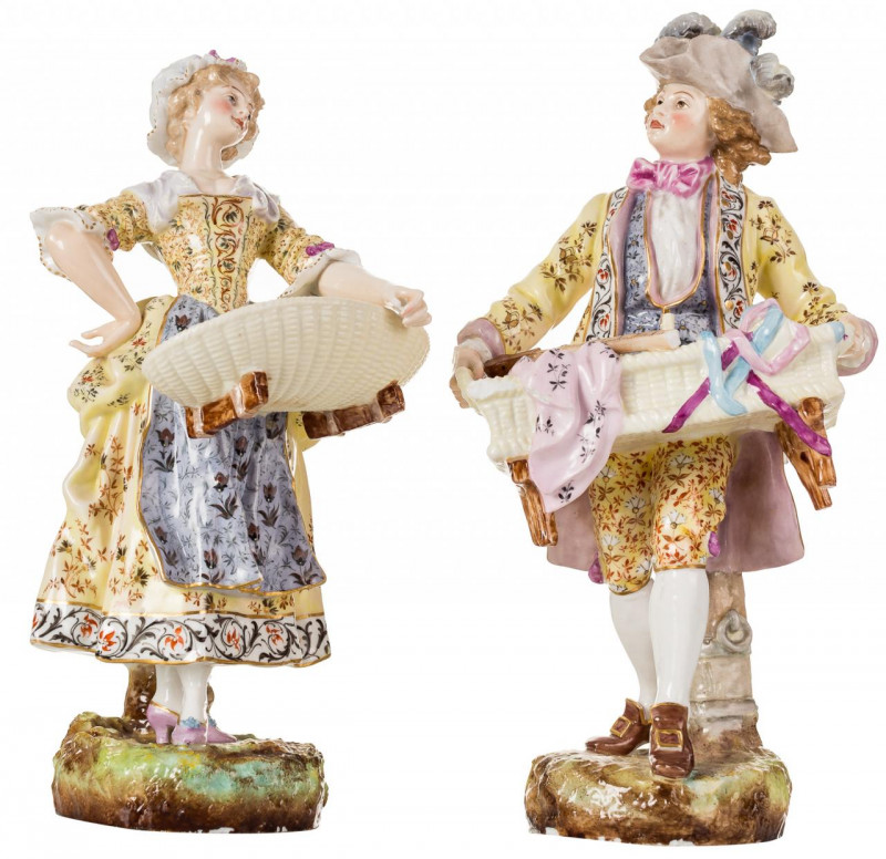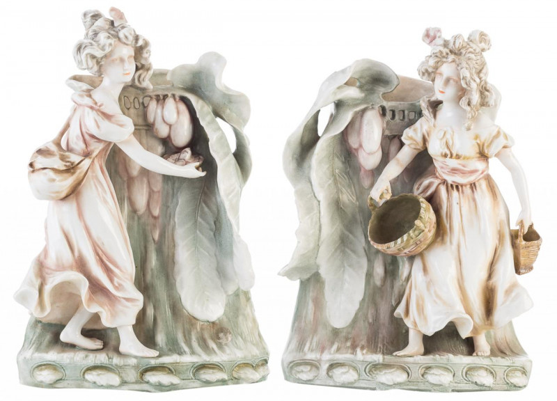 Pareja de floreros de niñas con cestas en biscuit. Estilo Art Noveau. Europa. Principios S. XX.