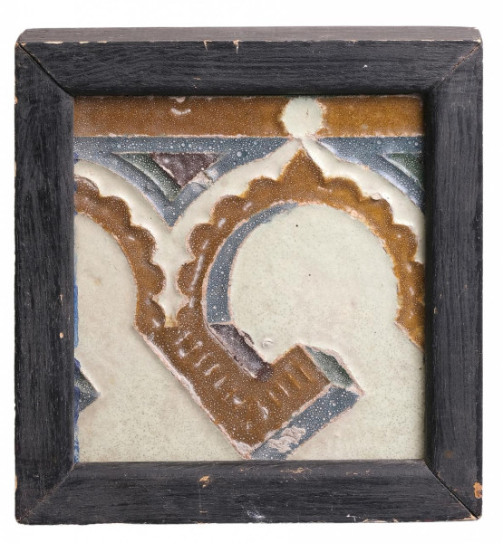 Azulejo en cerámica con restos de esmalte verde con intrincado motivo central de estrella central rodeado de elementos vegetales estilizados. España, S. XIX