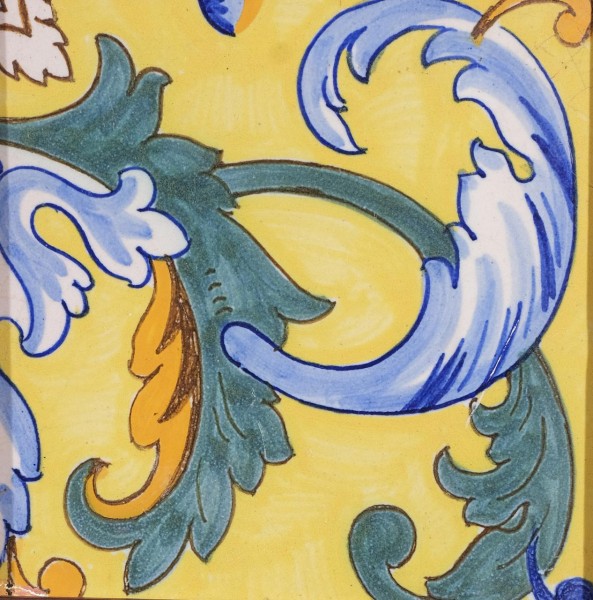 Azulejo en cerámica esmaltada de Triana de Ramos Rejano con decoración de roleos de hojas de acanto en azul, verde, amarillo y naranja. Sevilla, S. XX