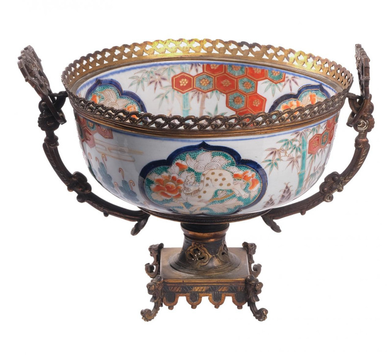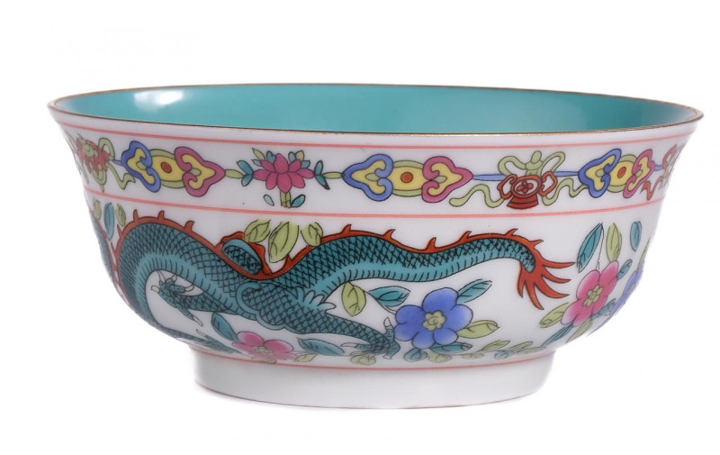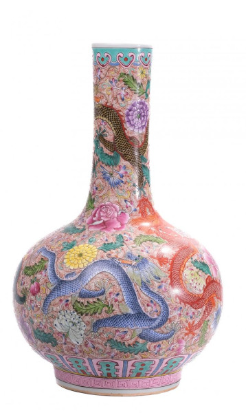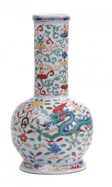 Jarrón en porcelana esmaltada con decoración polícroma de dragones sobre roleos. China, Dinastía Qing, probablemente S. XVIII