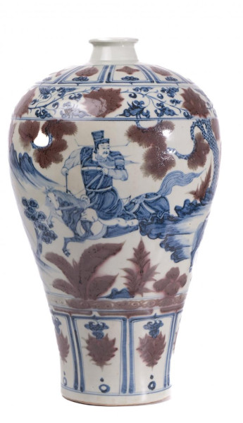 Jarrón Meiping en porcelana esmaltada en azul y marrón sobre fondo blanco con personajes y caballos sobre paisaje. China, S. XVIII - S. XIX