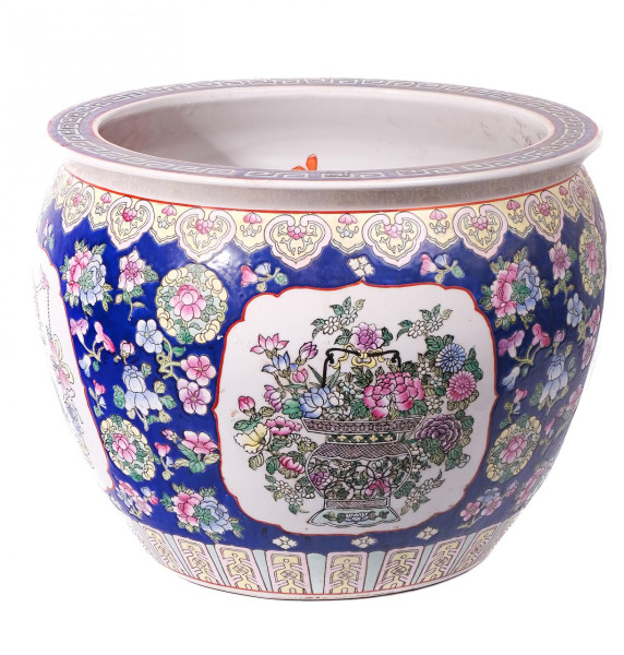 Pecera en porcelana esmaltada con decoración floral sobre fondo azul, floreros en reserva y peces en su interior. China, Fns. S. XIX - S. XX