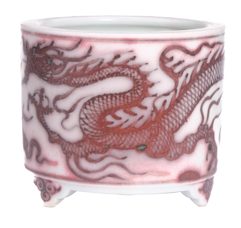 Tintero o bote para pinceles en porcelana esmaltada en marrón rojizo con decoración de dragón. China, probablemente dinastía Ming, S. XVII