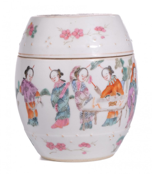 Pequeño tarro con tapa, probablemente para jengibre, en porcelana esmaltada con decoración de personajes. China, S. XVIII