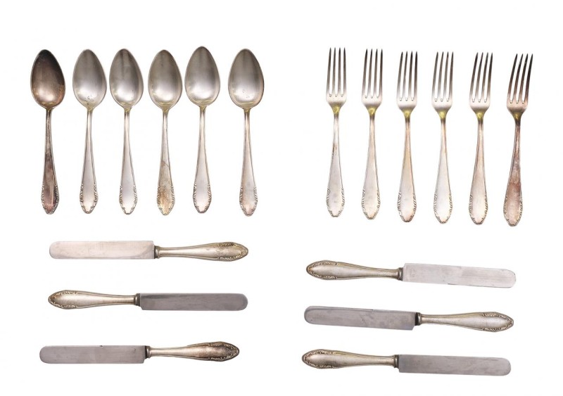 Cubertería de Meneses en alpaca para seis servicios con decoración vegetal en la parte inferior de los mangos. S. XX