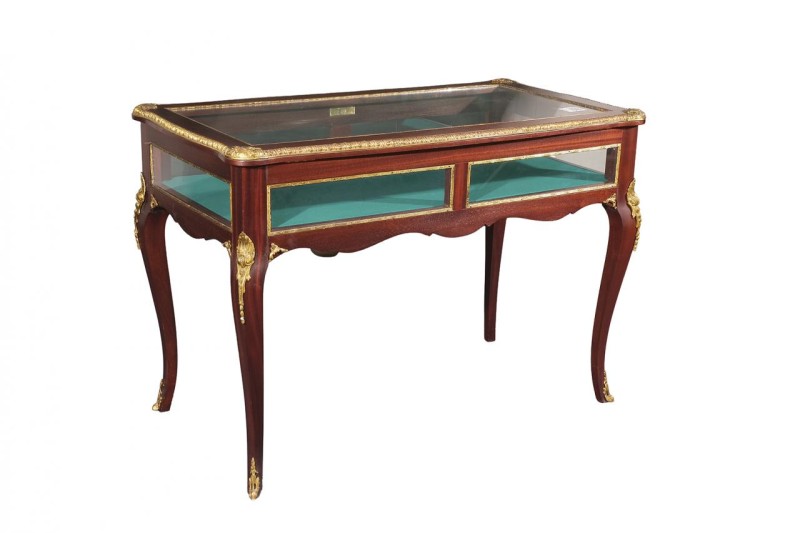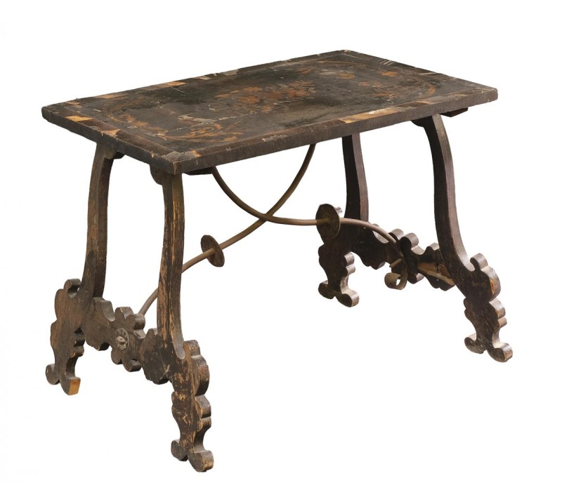 Pequeño bufet en madera con decoración de marquetería con motivos florales y vegetales, patas de lira y fiadores en hierro forjado. Mallorca, S. XIX