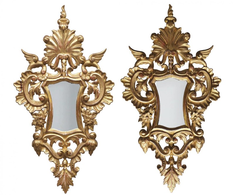 Pareja de cornucopias en madera tallada y dorada con decoración de rocalla, tornapuntas, hojas de acanto y pájaros. España, último tercio del S. XIX