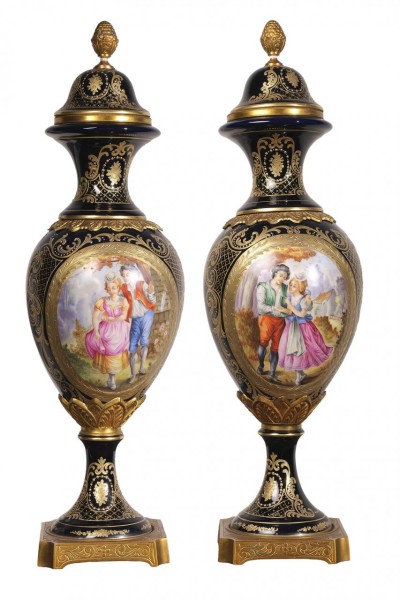 Pareja de jarrones con tapa en porcelana de Sèvres vidriados en "bleu du roi" con cartelas en el centro con escenas galantes y guarniciones en bronce dorado. Francia, S. XIX