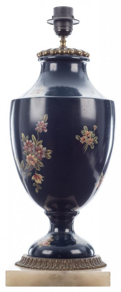 Pie de lámpara de sobremesa con decoración de ramilletes florales sobre azul y pie de mármol. S. XX