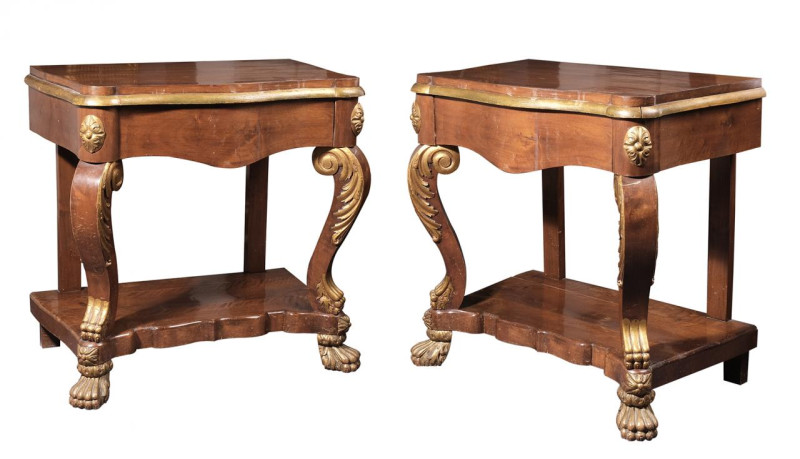 Pareja de mesitas de noche de estilo fernandino en madera tallada y parcialmente dorada sobre pies en forma de garra y cajón en cintura. España, S. XX