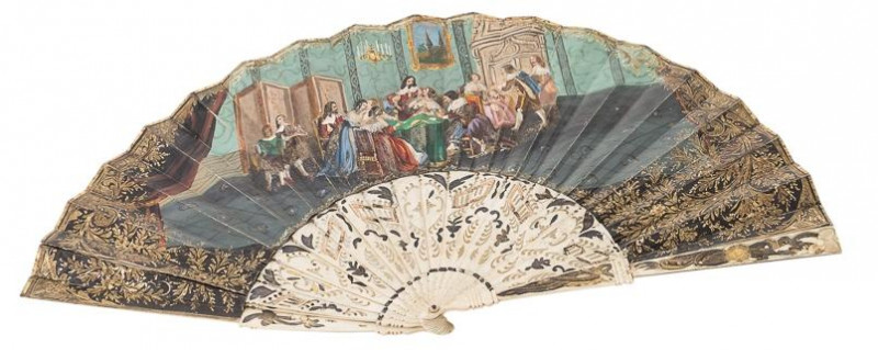 Abanico con varillaje en hueso calado y guardas a juego con clavillo en nácar. País litografiado y pintado con escena de velada con juegos en anverso y escena de lectura en reverso. S. XIX.