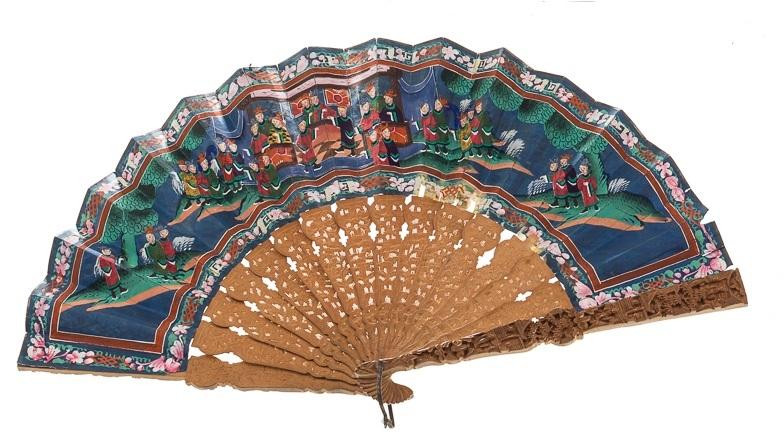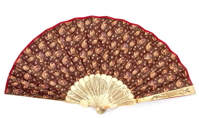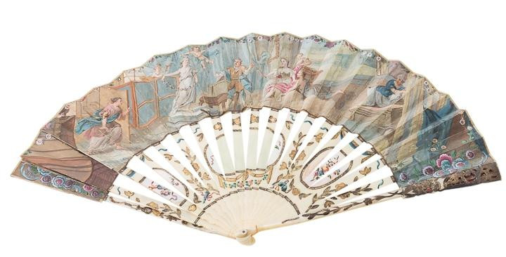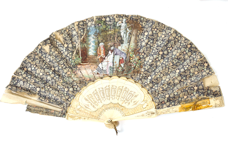 Abanico isabelino del S. XIX, con varillas en hueso calado. País en tela de raso totalmente decorada por flores con escena dieciochesca pintada a mano.
