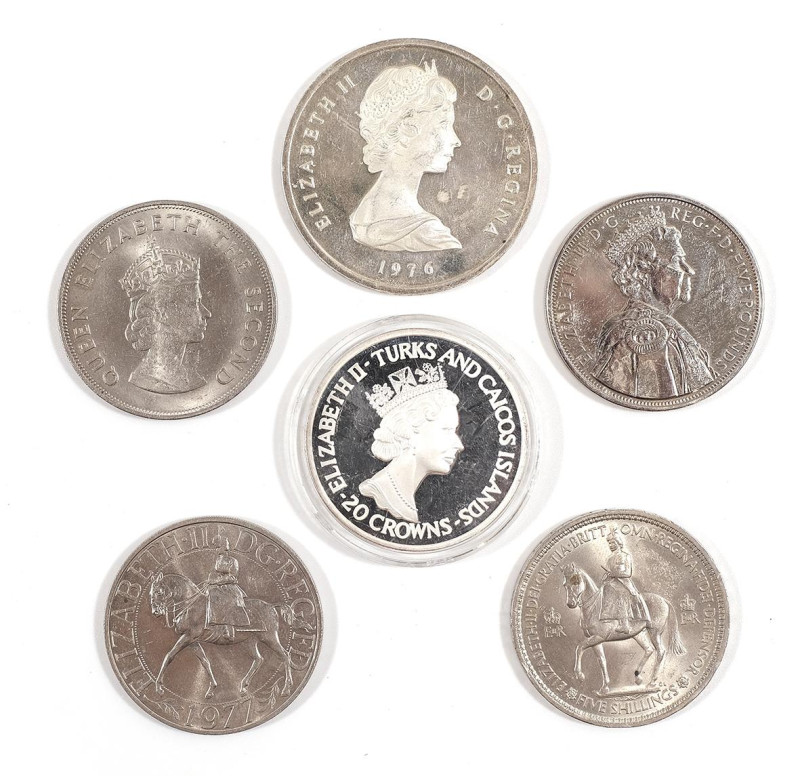 Lote formado por seis monedas y medallasconmemorativas de plata de la reina británica Isabel II.