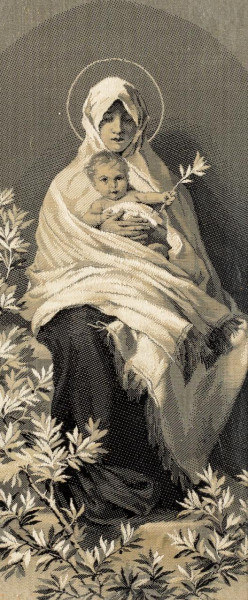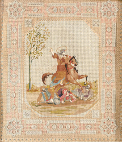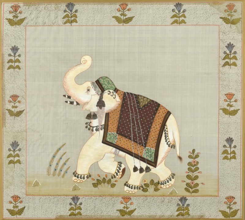 Seda hindú pintada a mano con elefante al centro enmarcado por cenefa floral. S. XX.