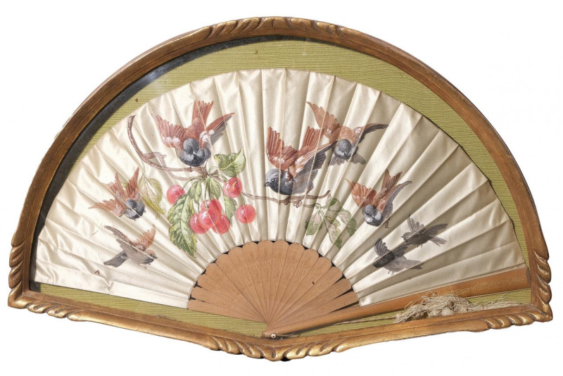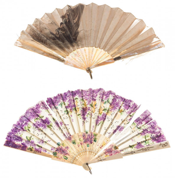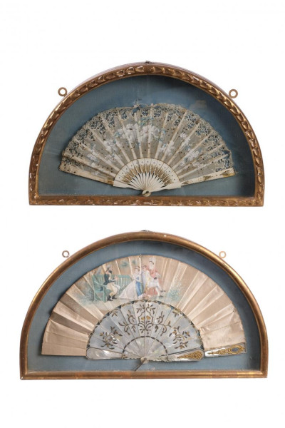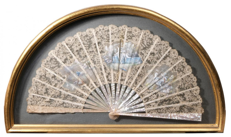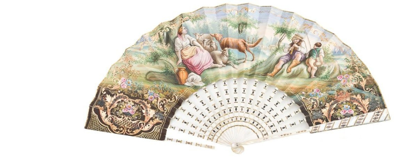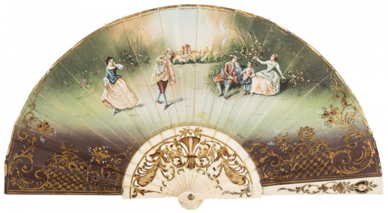 Abanico cristino con varillaje en hueso calado y parcialmente dorado. País en tela pintada a mano con escena de galanteo en anverso y paisaje en reverso. España, S. XIX.