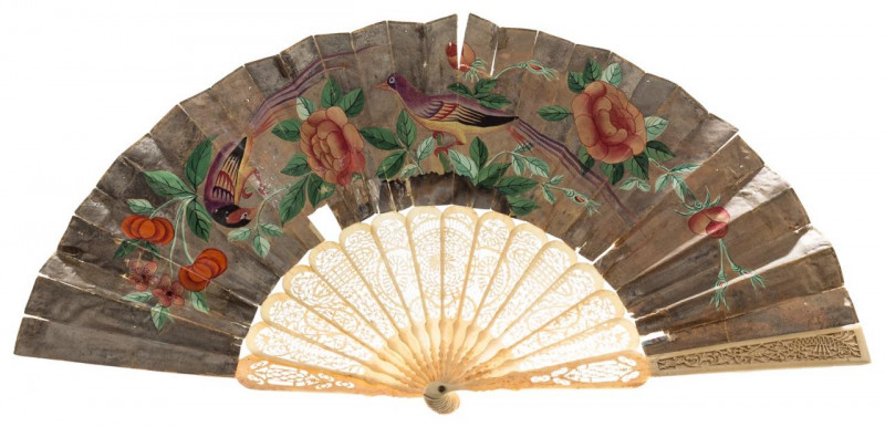 Abanico de las "Mil caras" con varillaje en hueso calado con país de doble hoja en papel pintado a mano con escenas palaciegas y personajes. China, S. XIX
