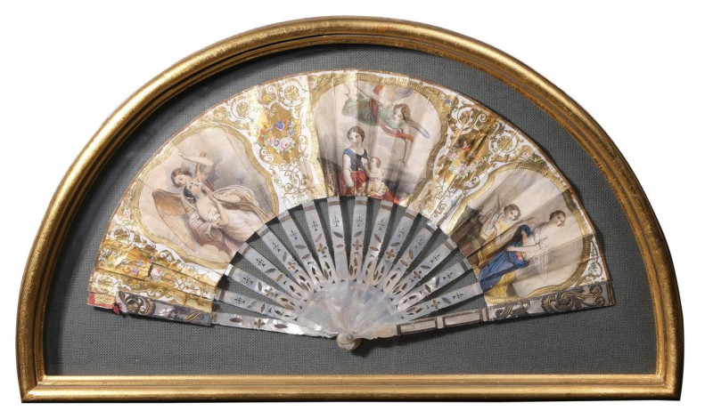 Abaniquera con abanico isabelino con varillaje de nácar y país en papel pintado con tres cartelas con personajes y ángeles. España, mediados del S. XIX