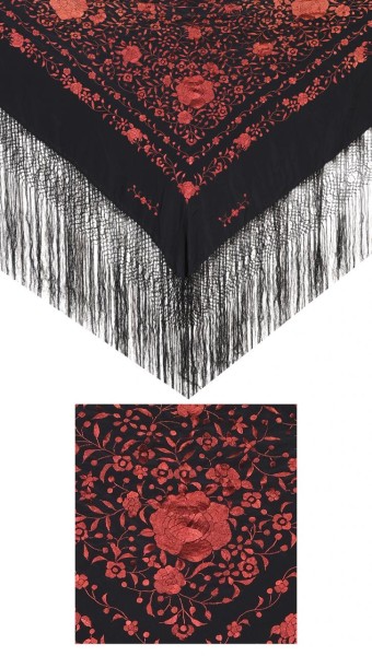Mantón de Manila en seda de color rojo con motivos florales bordados a mano en diferentes tonos de beige y rojos en una de las esquinas. S. XX