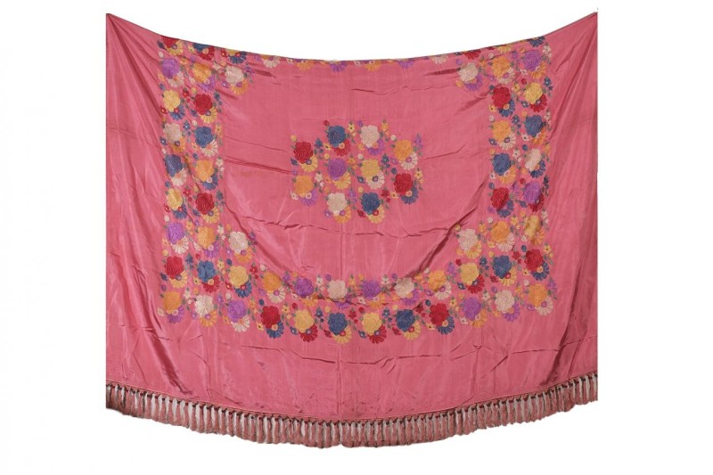 Colcha probablemente de Manilia en seda de color rosa con decoración floral bordada en diferentes colores. S. XX