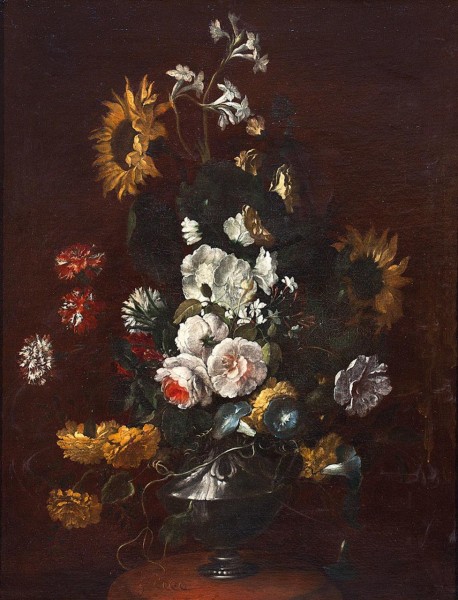 Jarrón con claveles, rosas y girasoles