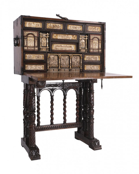 Bargueño en madera de nogal con aplicaciones en hueso. España, S. XVII.