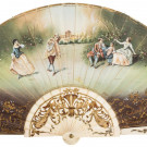 Abanico cristino con varillaje en hueso calado y parcialmente dorado. País en tela pintada a mano con escena de galanteo en anverso y paisaje en reverso. España, S. XIX.