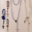 Conjunto de seis rosarios (dos de muñeca) enmarcados con pequeña moldura dorada perlada. S. XX.