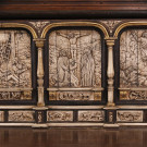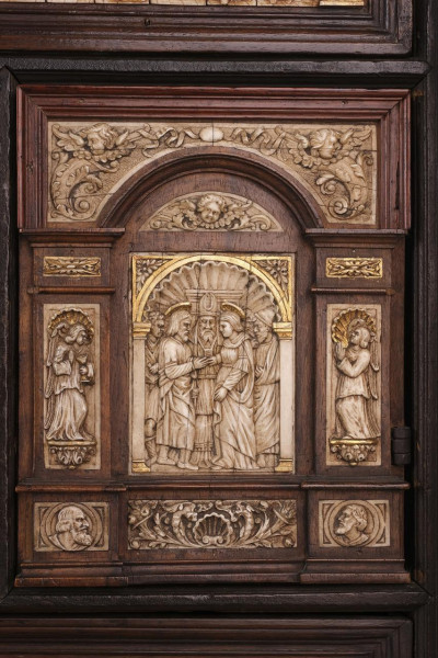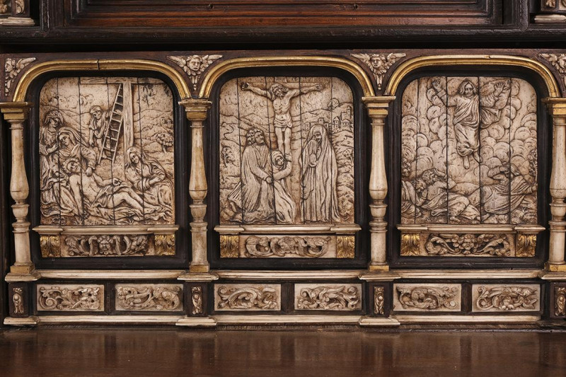 Bargueño de caja prismática apaisada de planta rectangular y tapa frontal abatible con interior estructurado en tres registros. El registro superior presenta cuatro gavetas apaisadas iguales; el mediano dos gavetas apaisadas en el centro, dispuestas una sobre otra, a cada lado una gaveta vertical en cada extremo una portezuela con cerradura; el registro inferior lleva en el centro una gaveta de gran tamaño con doble fondo y dos gavetas a cada lado, una sobre otra. El conjunto se ornamenta con extraordinarias placas de hueso aplicadas y talladas con relieves de carácter litúrgico, la gran mayoría alusivos a la vida de Cristo. Se apoya sobre pie de puente de tres arcos con decoración tallada y alargaderos rematados en venera. Herrajes en hierro.