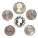 Lote formado por seis monedas y medallasconmemorativas de plata de la reina británica Isabel II.