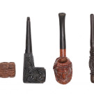 Lote formado por cuatro pipas con cuerpo en madera tallada. S. XX.
