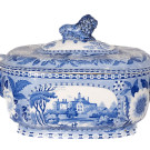 Sopera en porcelana esmaltada azul y blanca con decoración de paisajes y tapa rematada por león. Probablemente Compañía de Indias, S. XIX.