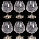 Estuche con seis copas de cognac en vidrio con decoración de uvas y hojas de parra grabadas y borde del pie en plata. S. XX