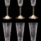 Estuche con seis copas de champagne en vidrio con decoración de uvas grabadas y pie en plata. S. XX