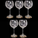 Estuche con seis copas en vidrio con decoración de uvas grabadas y pie en plata. S. XX