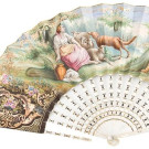 Abanico Cristino, PP. S. XIX, con varillaje en nácar con láminas de metal dorado sobrepuestas. País en papel litografiado e iluminado, con escenas cotidianas.