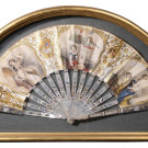 Abaniquera con abanico isabelino con varillaje de nácar y país en papel pintado con tres cartelas con personajes y ángeles. España, mediados del S. XIX