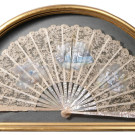 Abaniquera con abanico isabelino con varillaje de nácar y país en encaje blanco con cartelas de tul pintadas con ángeles. España, S. XIX