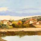 Paisaje con lago y casas