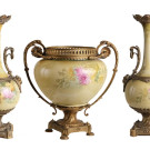 Guarnición compuesta por tres jarrones en loza con montura en bronce dorado. Probablemente Alemania, Ppio. S. XX