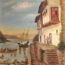 Paisaje costero con personajes y casas