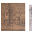 Personaje dieciochesco, estudio arquitectónico de interior y estudio de un brazo