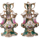 Pareja de jarrones con violeteros isabelinos en porcelana esmaltada en verde y dorado con decoración floral. España, mediados del S. XIX