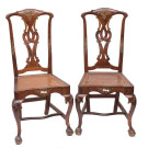 Pareja de sillas Chippendale en madera de nogal con decoración rococó de rocalla dorado, palas caladas y asiento de rejilla. Patas cabriolé rematadas en "claw and ball" con chambrana. Andalucía, S. XVIII