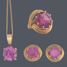 Aderezo de cocktail compuesto por pendientes, sortija y colgante ornamentado con amatistas engastadas en garras y en montura de oro amarillo 18 k. El colgante presenta amatista sintética en oro amarillo de 14 k. Peso total 29 g