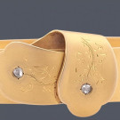 Brazalete rígido antiguo isabelino en oro amarillo de 14 k con decoración vegetal grabada y dos diamantes talla antigua. Cierre de cajetín con cadenita de seguridad. Diámetro 6 cm