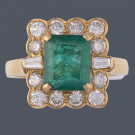 Sortija en oro amarillo de 18k con esmeralda central talla rectangular 2,20ct con engaste cuatro garras, orla de diamantes en talla brillante y dos en talla trapecio 1,36ct. Peso total 6,25g