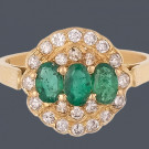 Sortija en oro amarillo de 18k con tresillo de esmeraldas sintéticas de talla oval de 0,70ct, pavé de diamantes talla brillante de 0,44ct. Peso total de la pieza: 3,16g