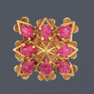 Sortija en oro amarillo de 18k con rubíes sintéticos en talla perilla. Peso total de la pieza: 8,80g